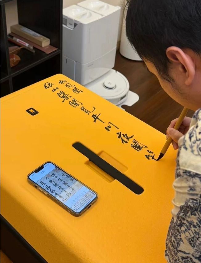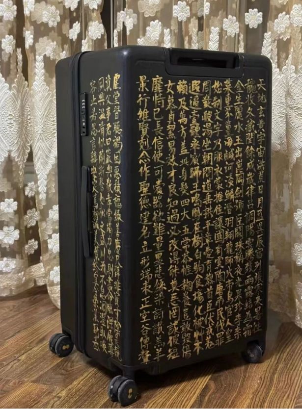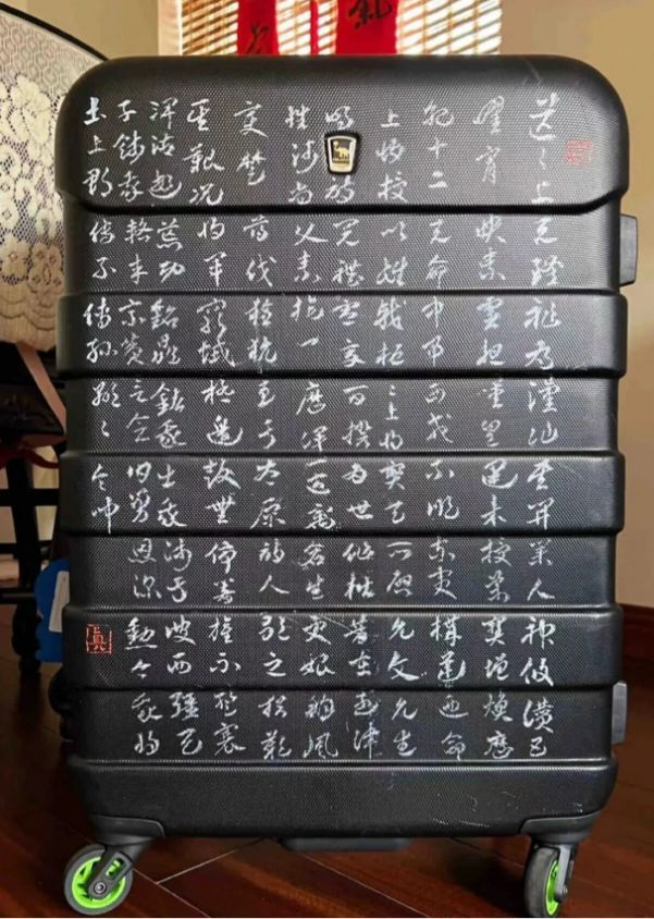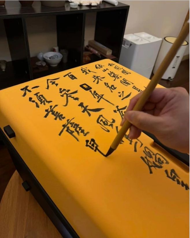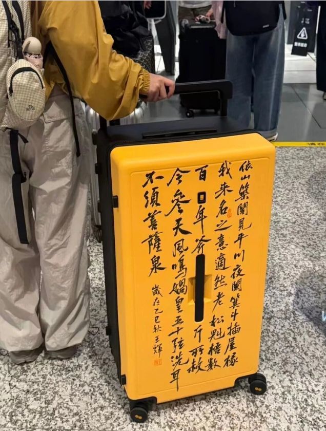 一位书道爱好者,正拿着羊毫,在明黄色的行李箱上,一笔一划摹仿黄庭坚的《松风阁诗卷》。手机里放着古帖原迹,笔尖落处,“依山筑阁见深谷,深夜箕斗插屋椽” 的千年墨韵,就这么落在了当代出行的行囊上。