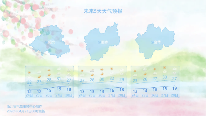 实践上,浙江雨势在昨天(4月23日)已渐渐贬抑,全域以小雨或稀薄小雨为主。浙中南体感闲散,大部最高气温稳定在17至21℃;但浙北地区凉意萦绕不散,仅13至15℃。