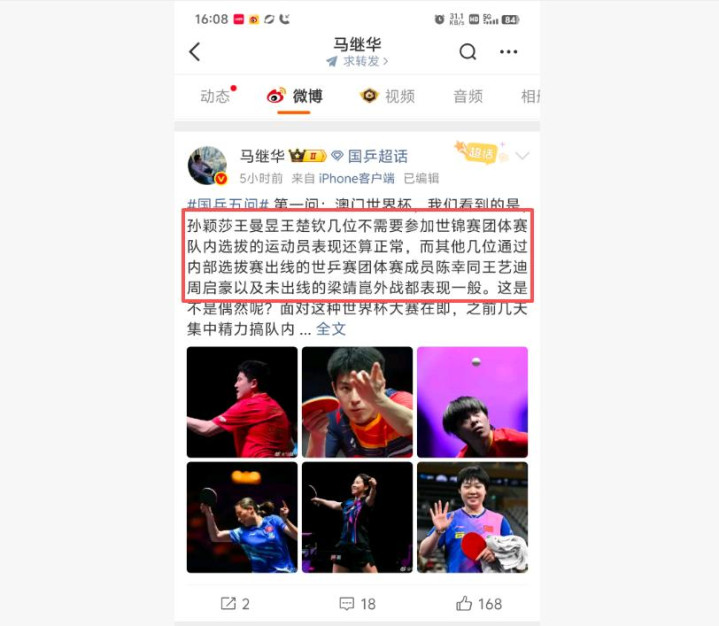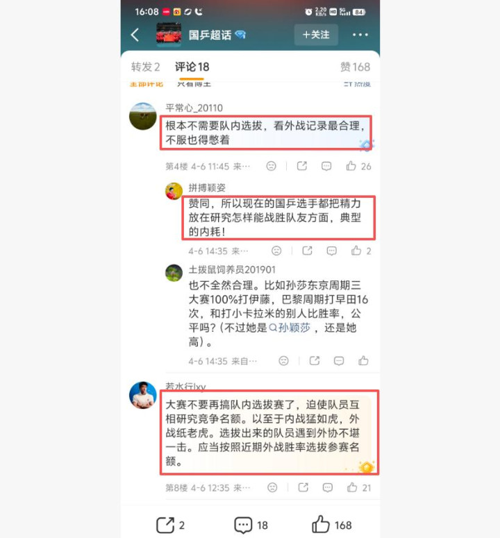 “根柢不需要对内聘任,就看外战记载”,“对内聘任,国乒资格放在探讨若何驯顺队友,这是内讧”,“对内聘任,队员相互探讨争限额,内战猛如虎,外战纸老虎”。上头球迷的话,不可说莫得道理。