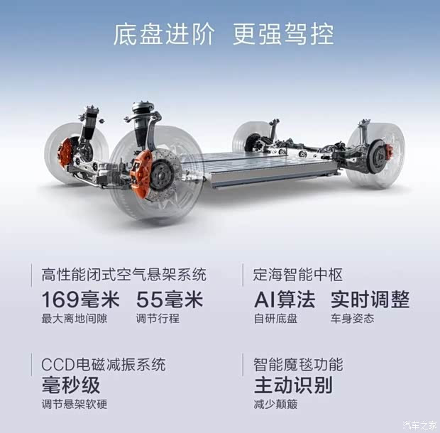 两款新车配备开阔AI数字底盘,全系标配闭式空气悬架+CCD电磁减振+智能魔毯。新增通顺+花样,共提供7种驾驶花样,四驱车型可选极氪赛谈花样,可目田调度扭矩分拨、能量回收、车身踏实和转向挡位。