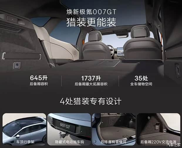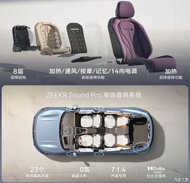 两款新车标配全景天幕,紫外线装扮率99.99%。座椅支持14向电动调度,前排提供加热/透风/推拿/系念功能,后排提供加热功能。新款极氪007领有642L后备厢容积,GT后备厢容积645L,放倒后排拓展至1737L,后备厢均提供下沉空间。极氪007GT还提供了车顶行李架和智能电动拖车钩套装,以及雪橇洞,标配220V电源。两款新车配备ZEEKRSoundPro音响,23扬声器+2160W+7.1.4杜比全景声。