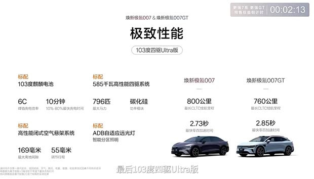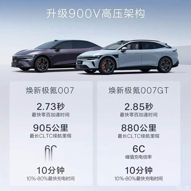 能源方面,两款新车全系升级900V高压架构,新款极氪007和新款极氪007GT后驱版最大功率均为370kW,四驱版最大功率相同都为585kW,新款极氪007的0-100km/h加快技术差异为4.8秒、4.6秒和2.73秒,CLTC最大续航里程为905km,CLTC百公里最拘泥耗12度。新款极氪007GT后驱版和四驱版的0-100km/h加快技术差异为5秒、4.8秒和2.85秒,CLTC最大续航里程为880km。两款车型均配备103kWh麒麟电板和75kWh神盾金砖电板,差异支持6C快充和5.5C快充,10%-80%最快差异仅需10分钟和10.5分钟。