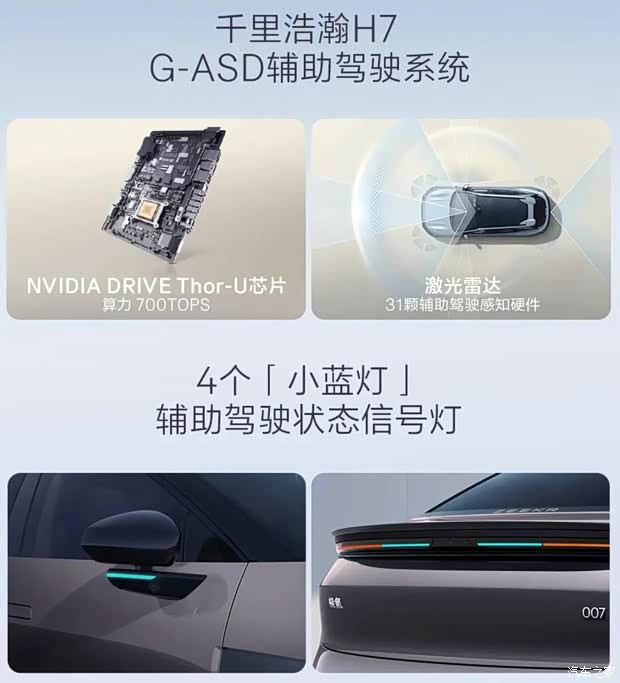 辅助驾驶方面,两款新车将标配含1颗激光雷达在内的31个传感器、最高700TOPS车端算力Thor-U芯片以及4颗智驾小蓝灯,禁受沉开阔H7决策,覆盖停车、领航辅助等全场景。