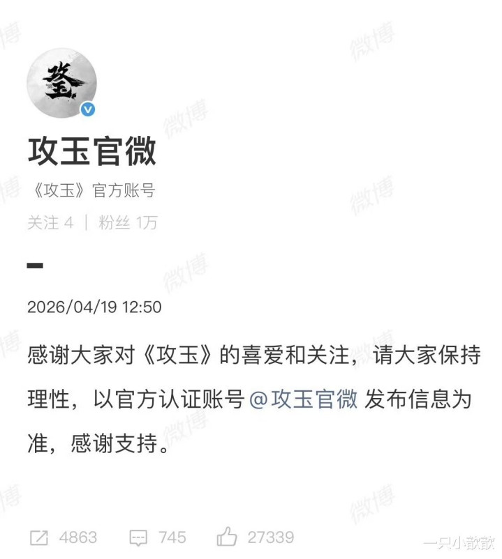 濒临这沸沸扬扬的听说,《攻玉》官方终于在4月19日“千呼万唤始出来”,发了一条号称“教科书级别”的公关修起:“感谢民众对《攻玉》的喜饶恕,请民众保持感性,以官方认证账号@攻玉官微发布信息为准,感谢撑持。”